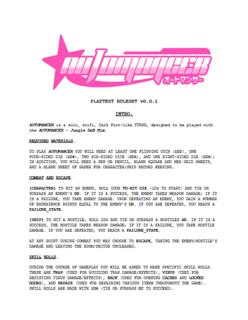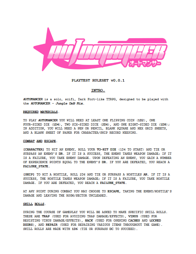 AUTOMANCER is a solo, scifi, Dark Fort-like TTRPG, designed to be played with the AUTOMANCER - Jungle DnB Mix (https://ordinary-company.itch.io/automancer).